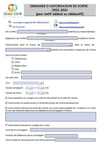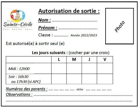 Les parents qui souhaitent que leur enfant puisse rentrer seul le midi ou le soir doivent impérativement faire la demande de carte de sortie. Cette dernière sera réalisée par l'enseignant de votre enfant à la réception du formulaire que vous trouverez ci-dessous.
